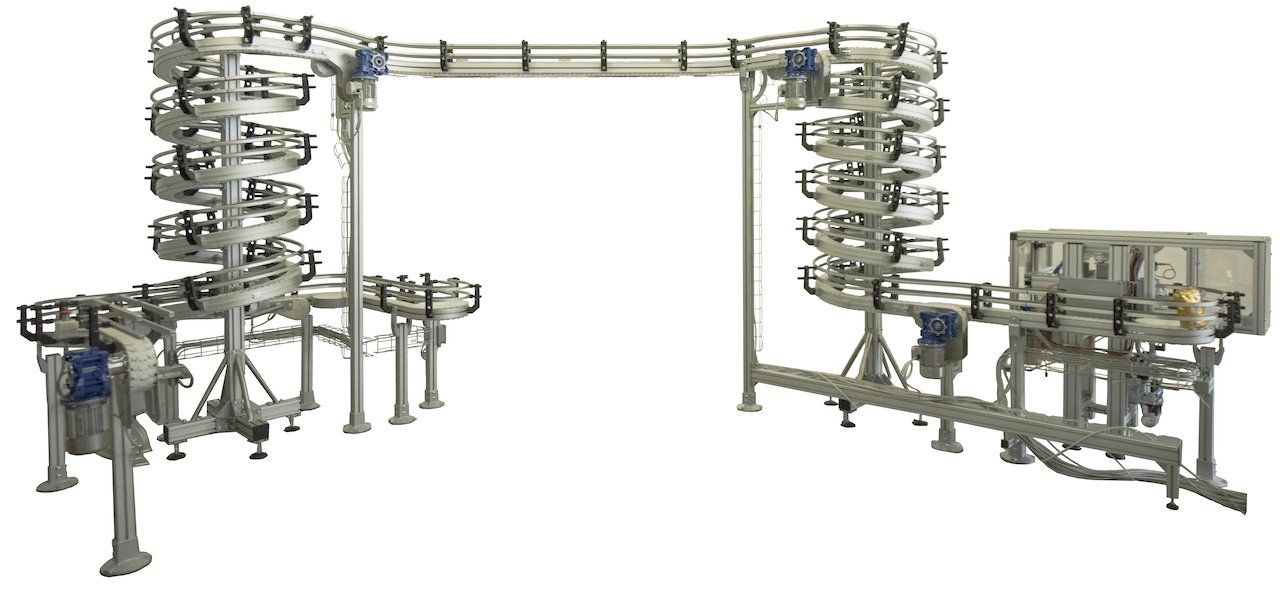 Spiral production with double or triple independent track. Direction of travel on request (up-up, up-down, down-down). Chain dimensions and diameters according to the project